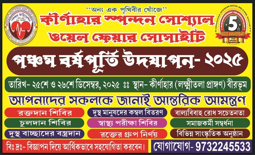 As it marks its 5th year of selfless service, the society invites everyone to join the “Pancham Barsha Purti Uddhyapan – 2025”, a two-day celebration filled with community activities, awareness drives, and cultural performances.